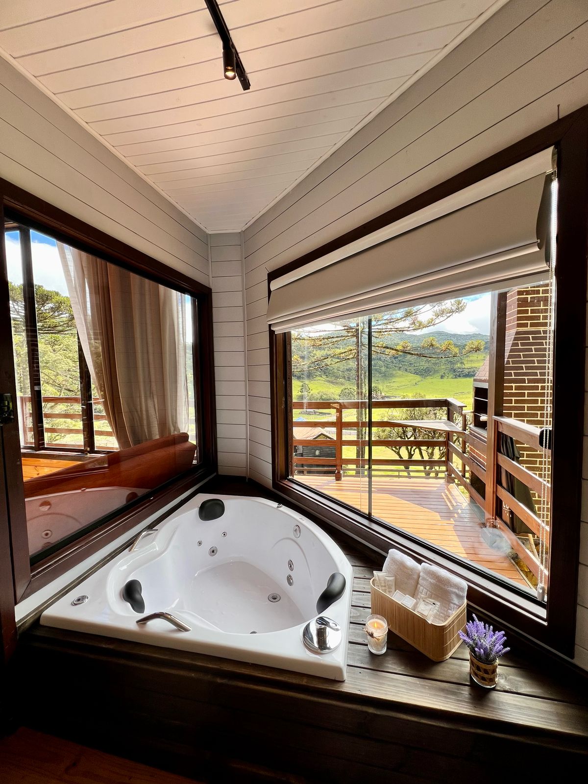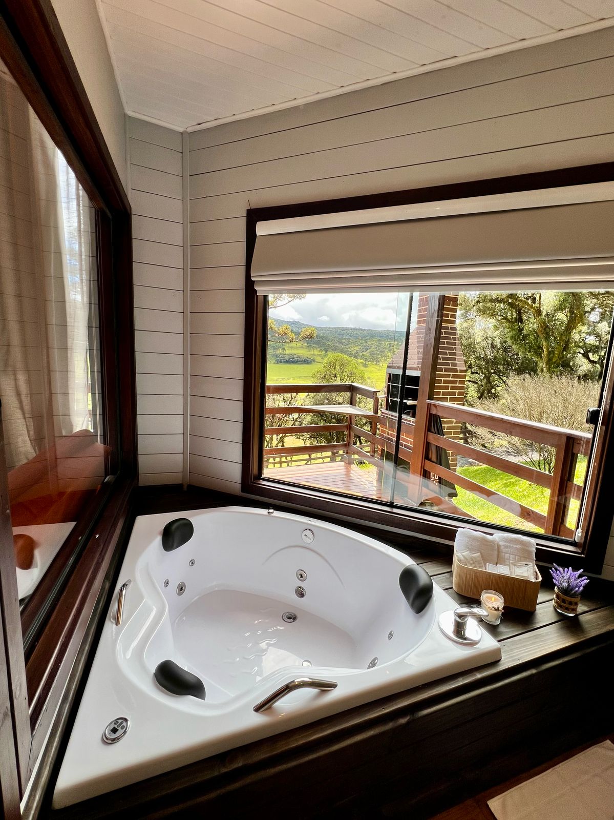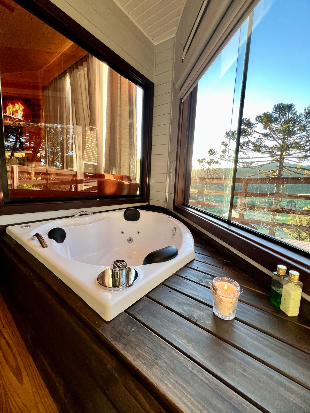 - Comodidades (umidificador de ar, cama queen size, roupas de cama, ar condicionado quente e frio, banheira de hidromassagem, cozinha completa, talheres e louças, lareira ecológica interna, secador de cabelo, secador de toalhas, Toalhas, cobertor extra, roupão)